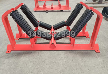 帶式輸送機(jī)緩沖托輥組安裝在輸送機(jī)受料段的下方,減小落料時物料對輸送帶的沖擊,以延長輸送帶的使用壽命。